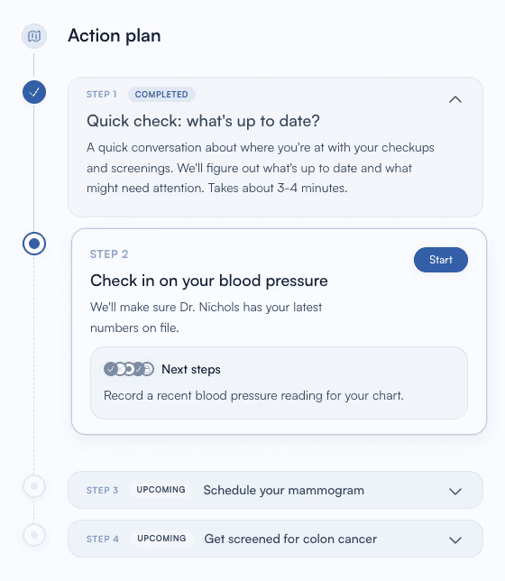 Each protocol becomes a personalized patient mission, matched to that person's history and conditions. They complete specific health actions outside visits. You get verified completion data, not engagement metrics.